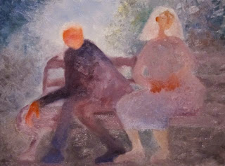 After seeing the work of Milton Avery, I felt encouraged to go ahead and do cartoon-like paintings. Now in critiques, the teachers warn me not to get too "cartoony." There are some ways to reduce the cartoon look -- mute the colors and make the heads small. In the oil painting below, I muted the colors and eliminated the heads.